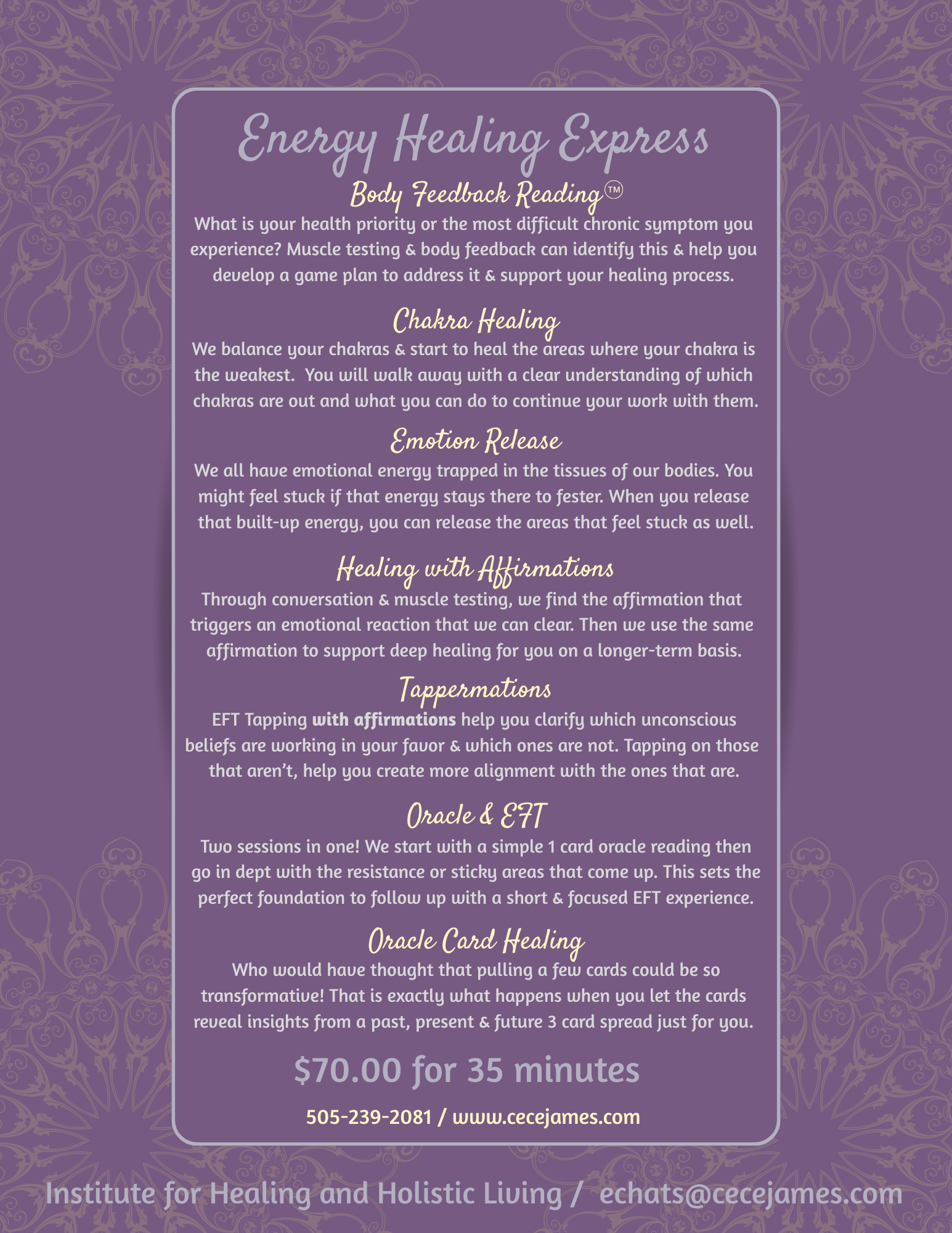 Founder of the Institute for Healing and Holistic Living, cecejames.com and the creator of the Body Feedback Formula. For almost 3 decades, Cece has been passionate about her mission to bring healing strategies to others and create a loving culture of Self-Care. She has spent much of this time supporting individuals and families facing chronic illness or other health challenges with wholistic living/healing skills through Muscle-Testing and DIY-Kinesiology. When Cece is not nerding out on all things body, she's enjoying time with her adored family; husband of 30 years, two adult children, their beloved German Shepherd and 2 precious cats. Read more about Cece HERE and praise for Cece HERE.