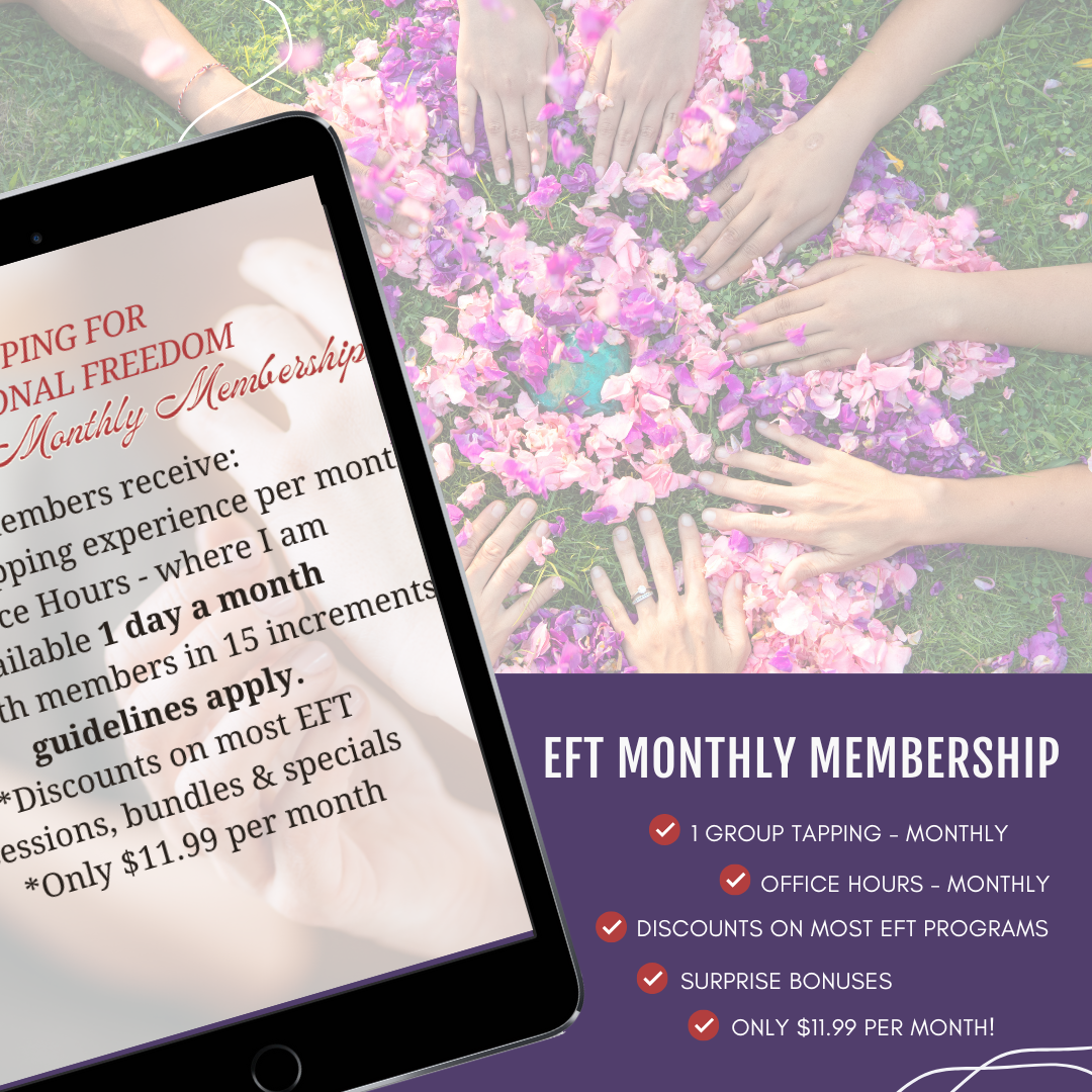 *You will also benefit from monthly office hours as a Tapping for Emotional Freedom Monthly Member. 1 day a month I will be available to personally tap with members of the community if things come up that can't wait until the next monthly meet up. This time available is limited to 15-minute slots that must be requested 24 hours or more prior to designated office hours. If the issue is more in depth and requires a more complete one on one session, you will be invited to schedule that or better yet a bundle so you know exactly how you will be held throughout your healing process.